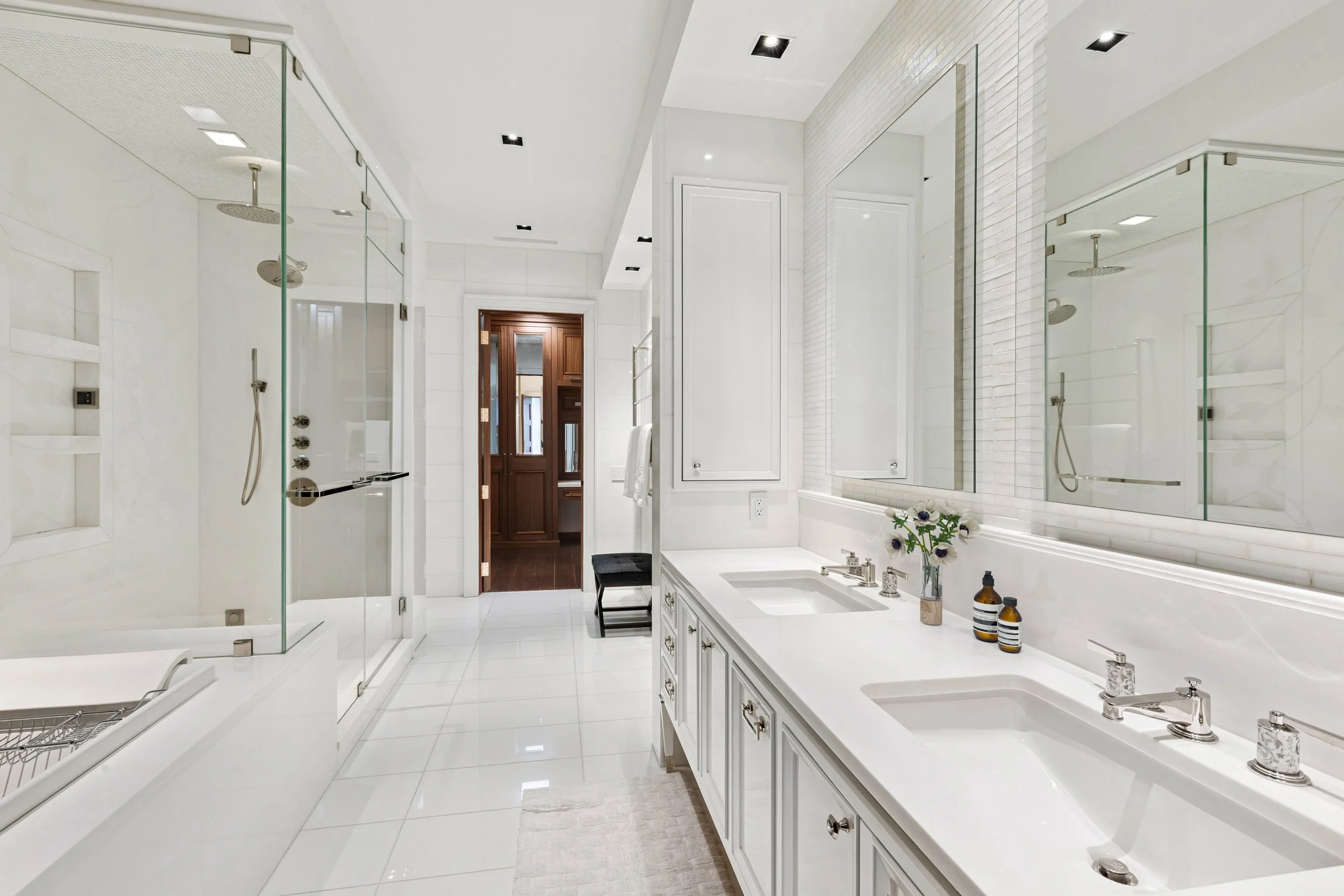 The entire third level is dedicated to a luxurious primary suite. With 11-foot ceilings, a gas fireplace, and a private terrace, the bedroom is both grand and intimate. The spa-like primary bathroom showcases Thassos marble, radiant heated floors, a steam shower, soaking tub, and premium fixtures by Fantini and THG. A custom dressing room with floor-to-ceiling millwork and an additional sitting area—ideal as an office or expanded closet—complete this level.